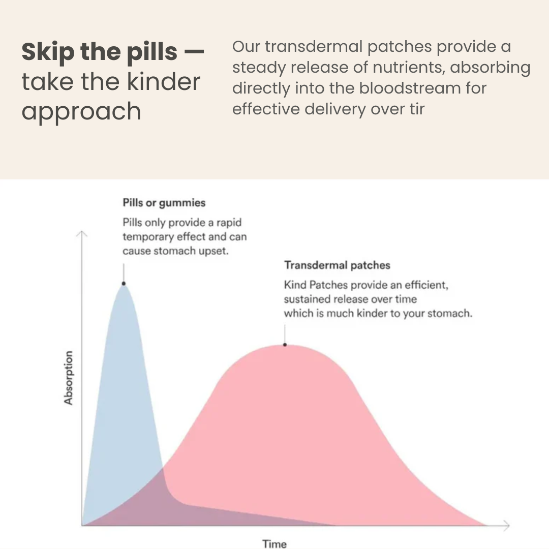 Our transdermal patches deliver a steady release of nutrients directly into your bloodstream, providing long-lasting relief without the ups and downs of pills.